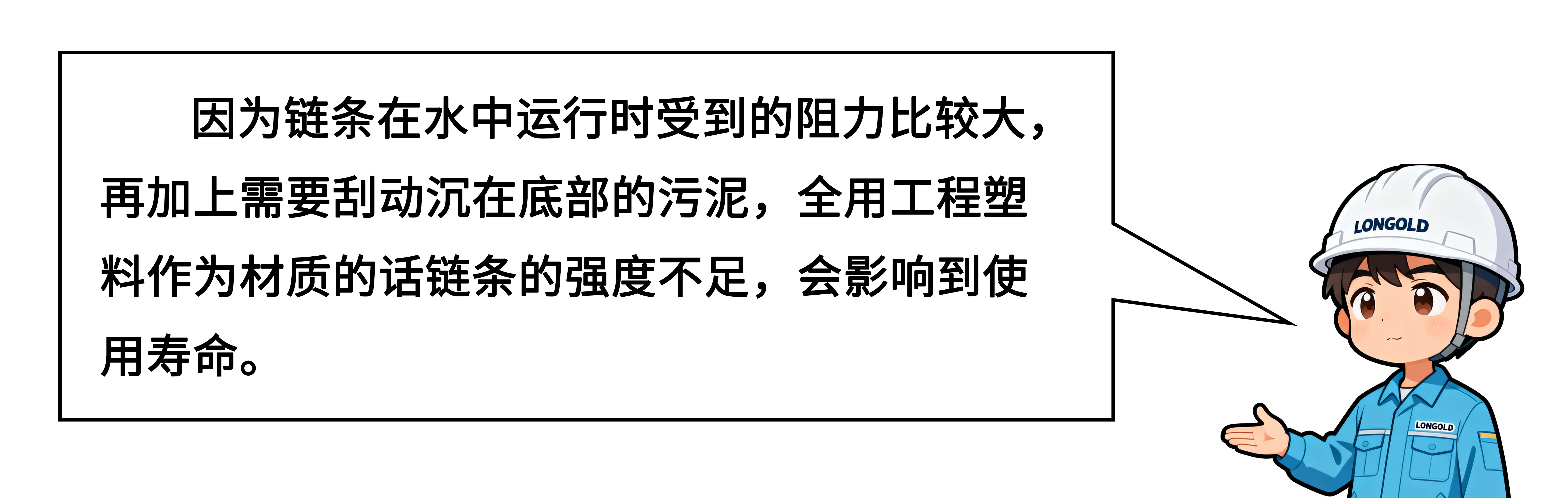 當鏈條帶動刮泥擋板經過水面上方時,便可以將污水表面的油脂油污刮走,而當鏈條轉到水面之下時,又可以刮動池底沉積下來的淤泥以及微生物到指定的位置,從而完成對水體的進一步凈化。